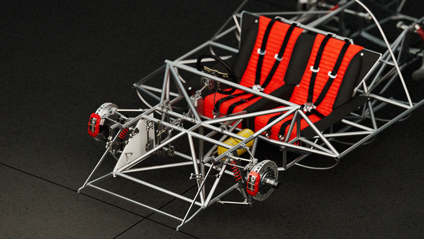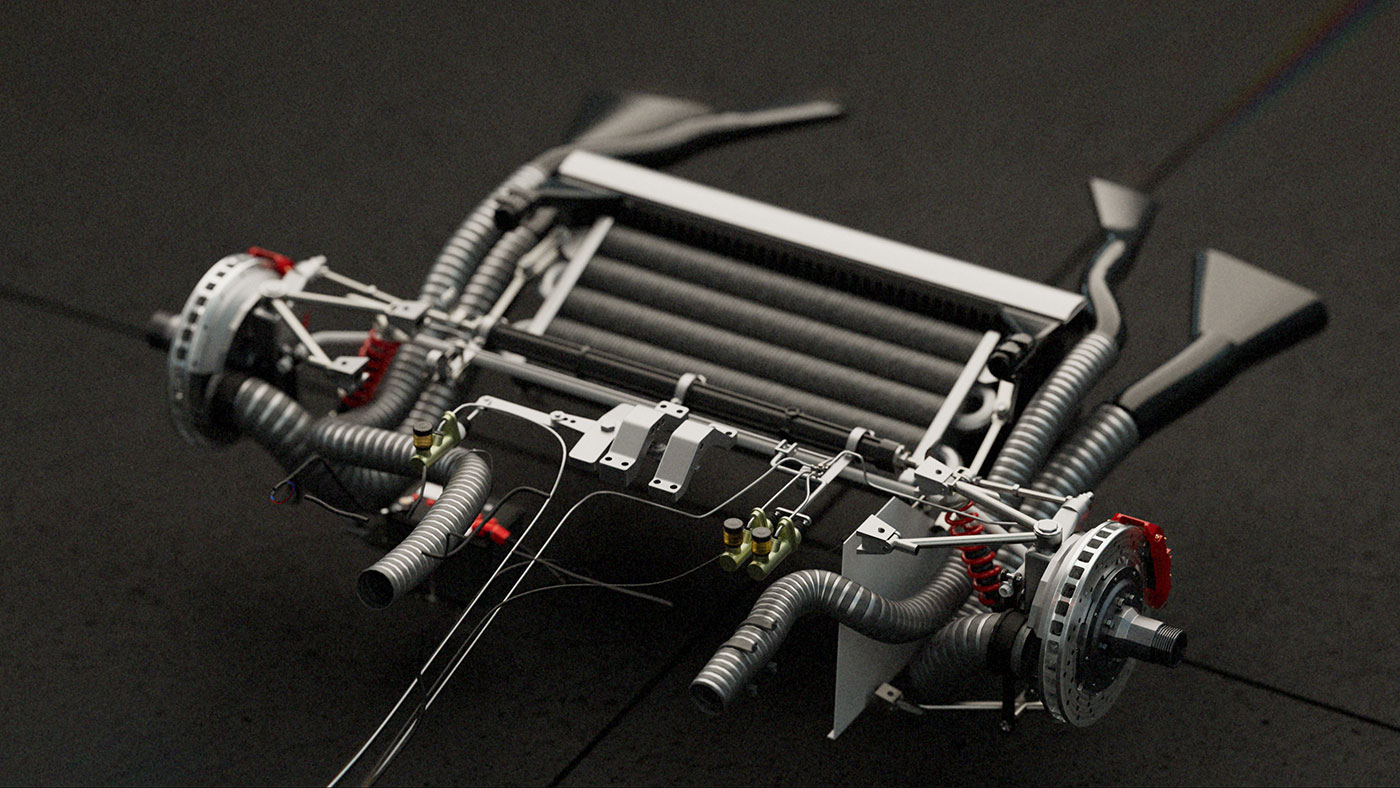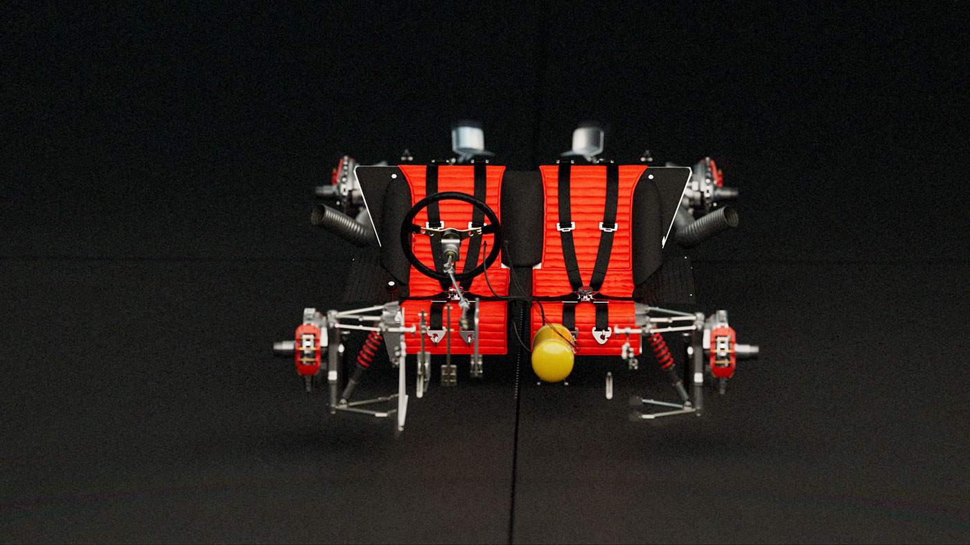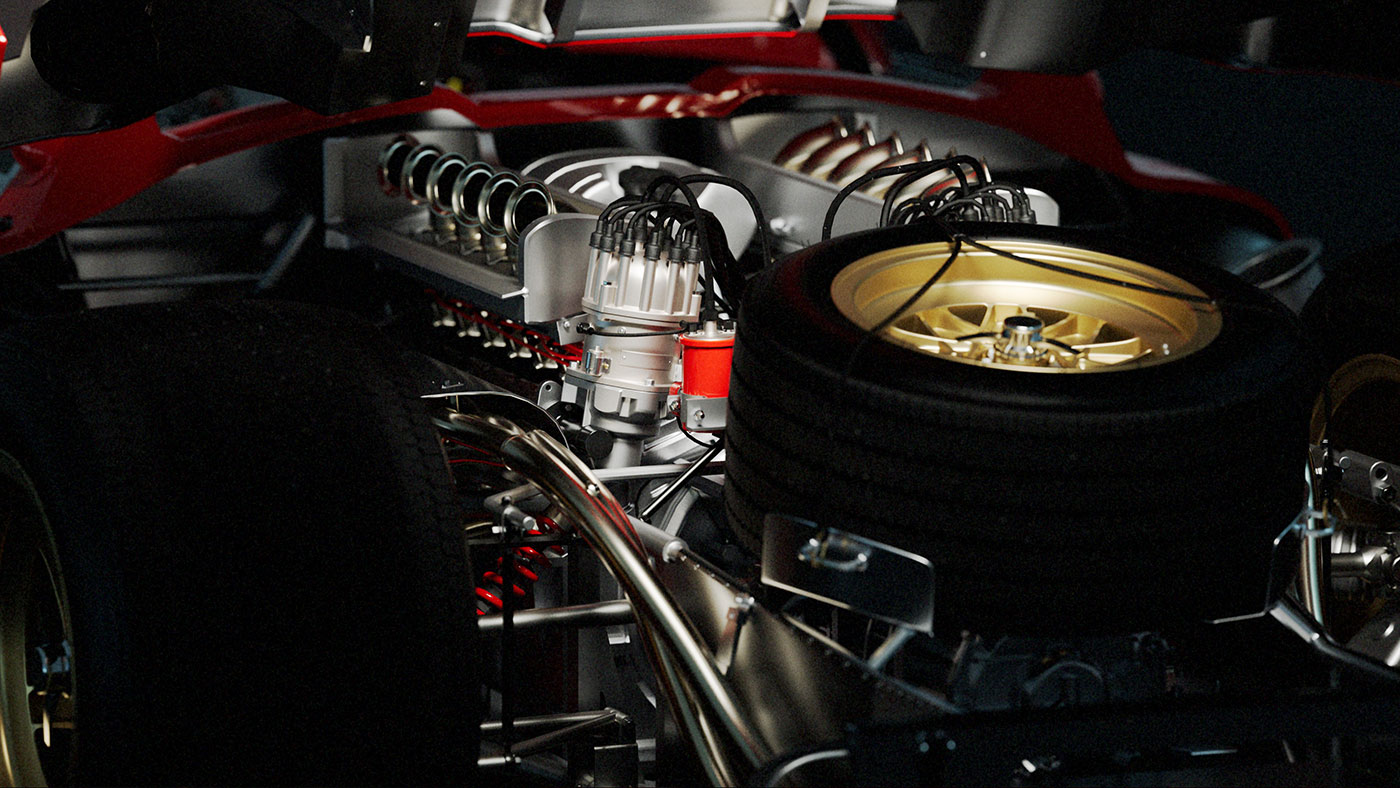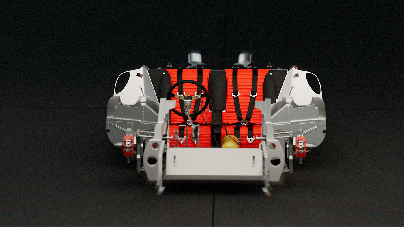 Inside the shell, the 330 P4’s internal architecture is revealed. A tubular steel frame, minimalist cockpit, and race-bred components speak to a design philosophy rooted in control and clarity. The cabin is spare but intentional—every surface built for feedback, every material chosen for speed. The seating, steering, and exposed framework reflect a time when cars were designed from the inside out, with nothing added that didn’t serve the drive. The result is an intimate view of a racing machine stripped to its essence—pure, mechanical, and timeless.